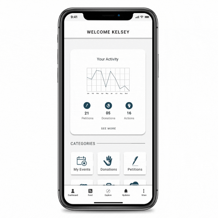 A dashboard page, illustrating to users how many petitions they’ve signed, how many donations they’ve contributed, as well as how many events they’ve attended.