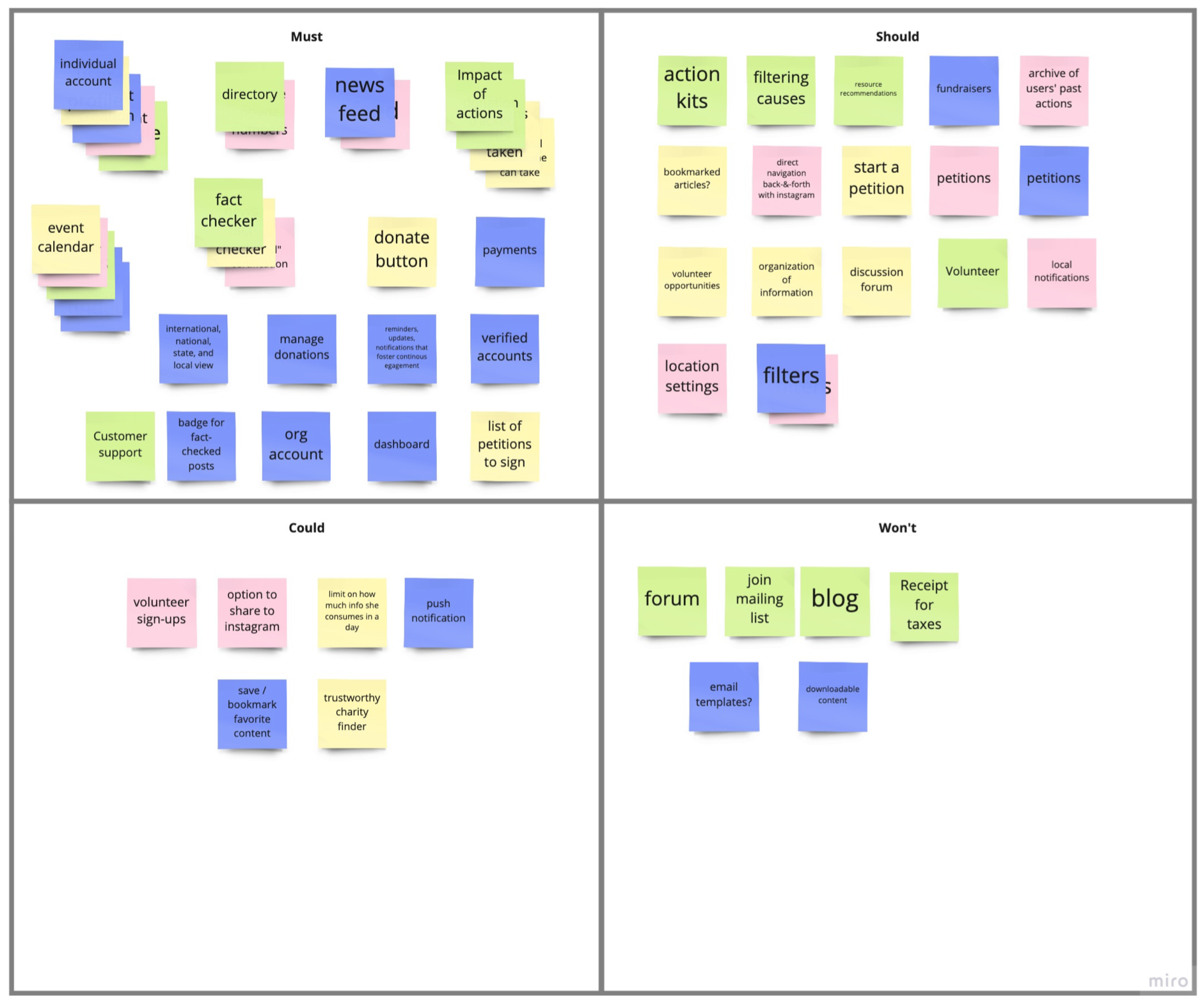 Crafting a Feature Analysis further allowed us to break down the offerings of other companies in the landscape, identifying additional gaps for our product to fill. We learned that social media platforms do not guarantee accuracy of shared information, and while they may feature donation buttons, they don’t offer meaningful routes to participation in social activism within their products. Single-issue organizations provide both information and opportunities to take part, but not across several organizations