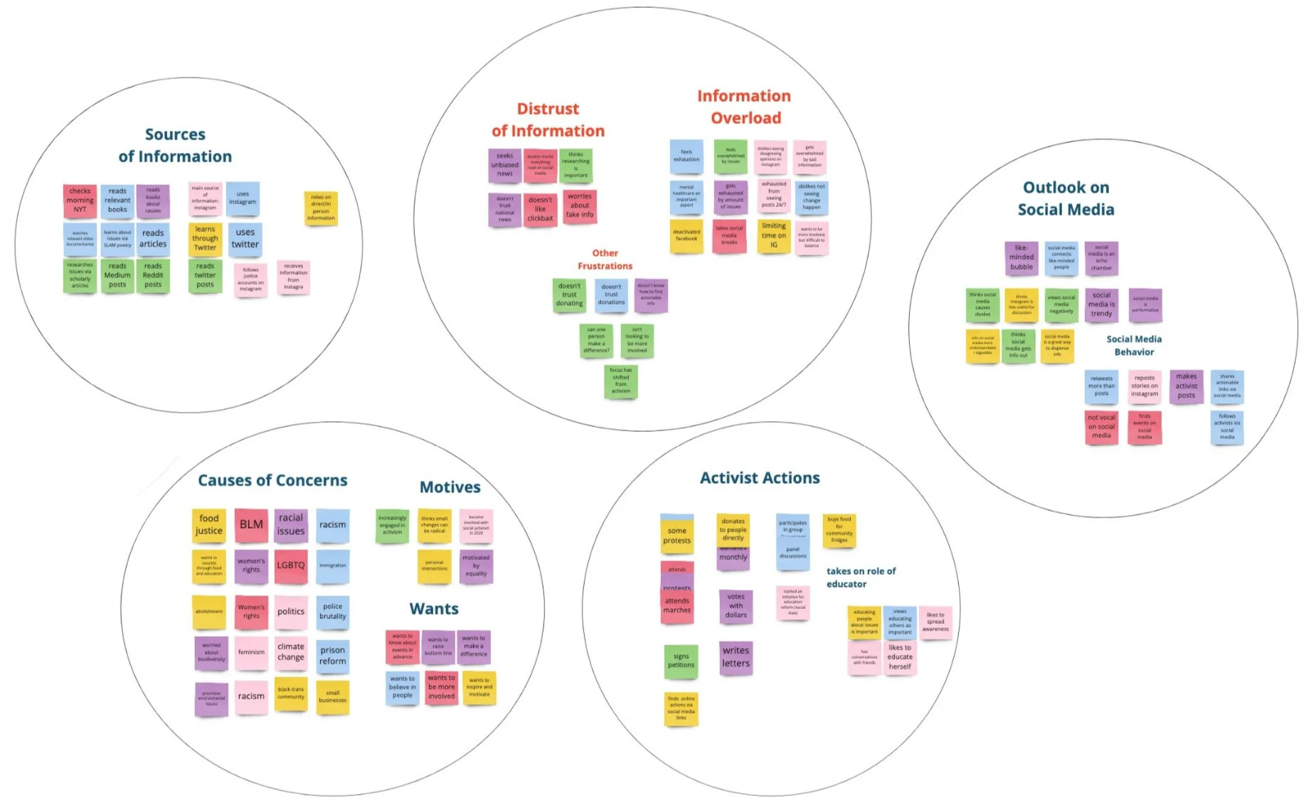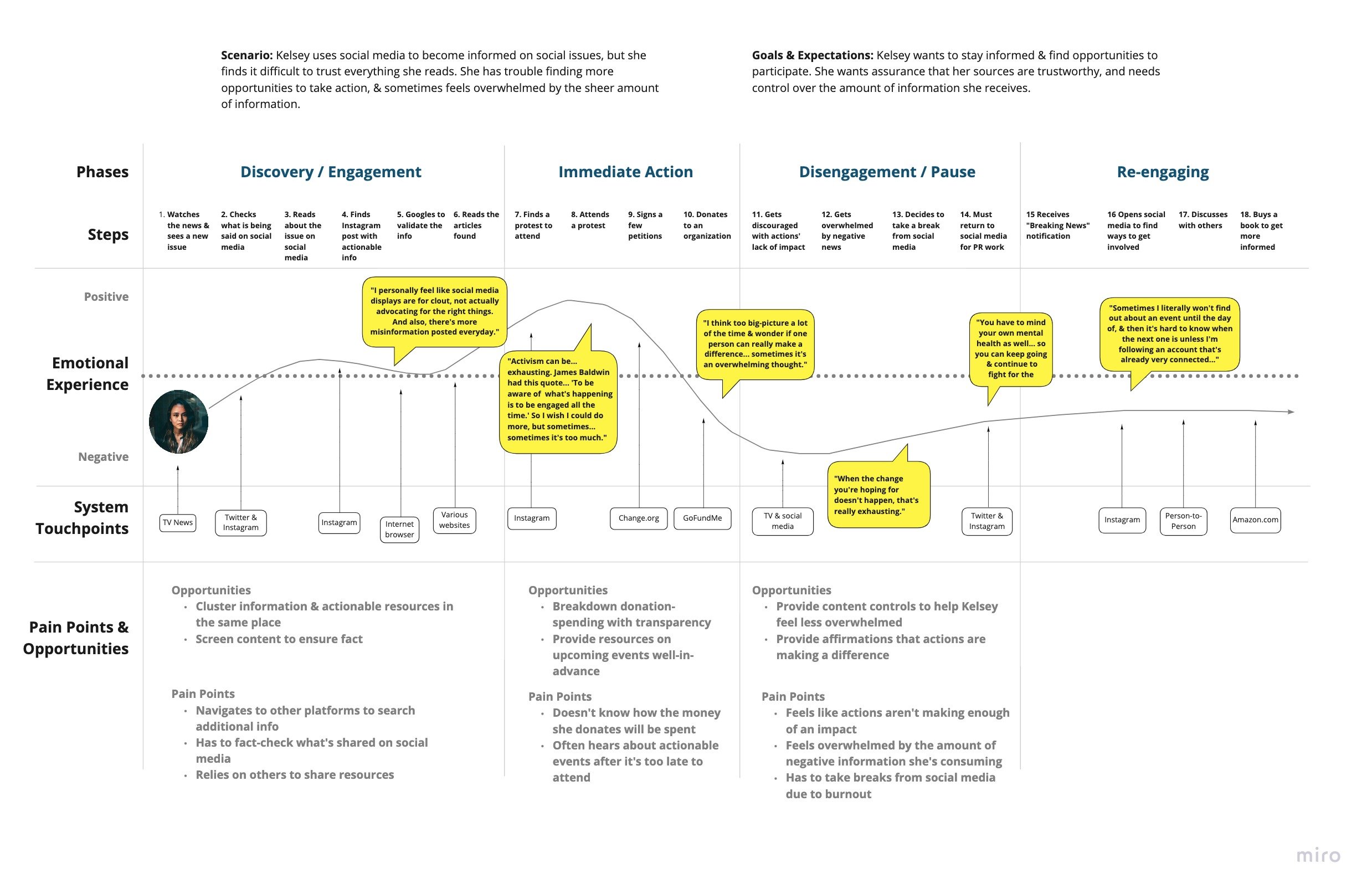 We visualized Kelsey’s process as she looked for ways to stay informed and engage in social justice. Synthesizing our data through a technique known as Journey Mapping, we noted the key actions Kelsey took, the frustrations she harbored, as well as her overall mood during specific instances of her journey. Through this exercise, we gained a better understanding of what users such as Kelsey encounter, and pinpointed opportunities to leverage in order to create a better experience for our target audience.