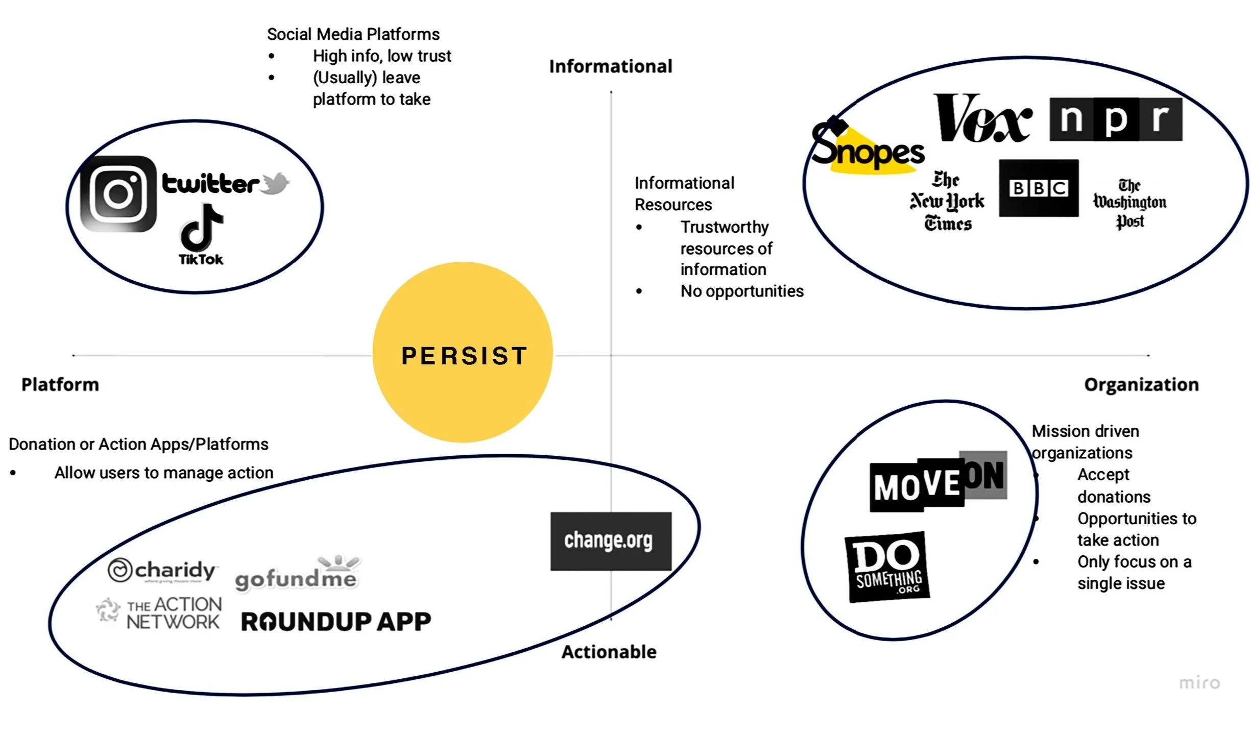 This Competitive Matrix allowed us to visualize the functions served by various platforms, organizations, and resources within the realm of social activism. We could clearly see that many competitors are clustered in the periphery of the given axes, leaving us with opportunities to create a platform-based solution that employs trustworthy information and incentives to participate.